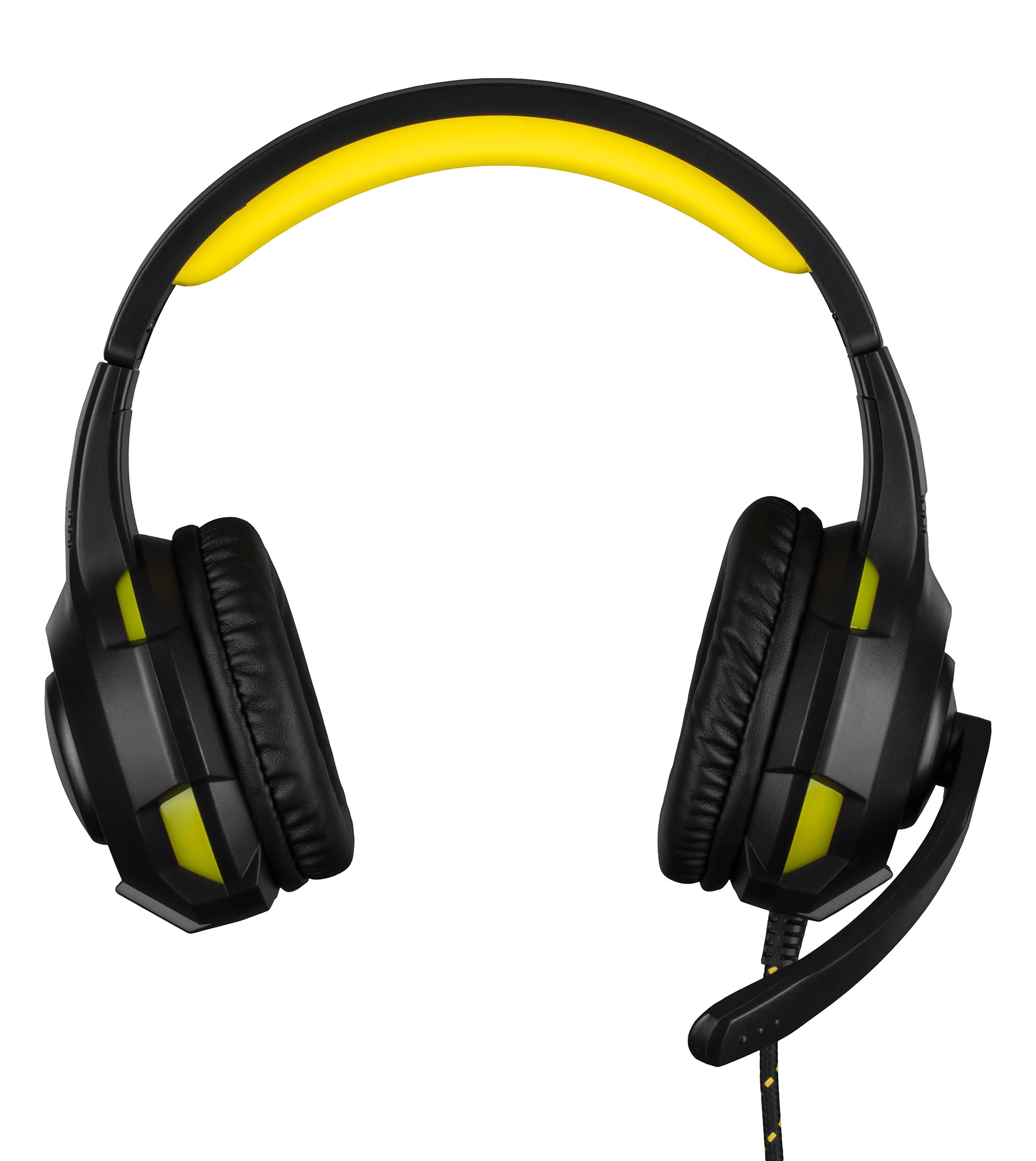 Повнорозмірні дротові навушники чорного кольору з оголов'ям. Інтерфейс підключення: F 3,5 мм × 2+USB 2.0 (підсвічування). Матеріал амбушюр – екошкіра. Довжина кабелю з тканинним обплетенням - 2 м, на ньому розташований контроль гучності та світла.